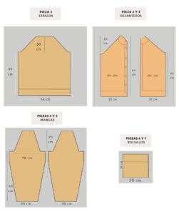 Pieza 1 espalda: 56 cm ancho, 49 cm largo hasta la sisa, 20 cm desde la sisa hasta el cuello.
